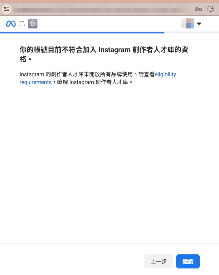 這通常有兩個原因:第一,你的 Instagram 帳號不是「專業帳號」(商業或創作者帳號)。請務必到 IG App 內切換。第二,你可能沒有在應用程式的產品列表中新增「Instagram Basic Display」。請確認這兩點都已完成。