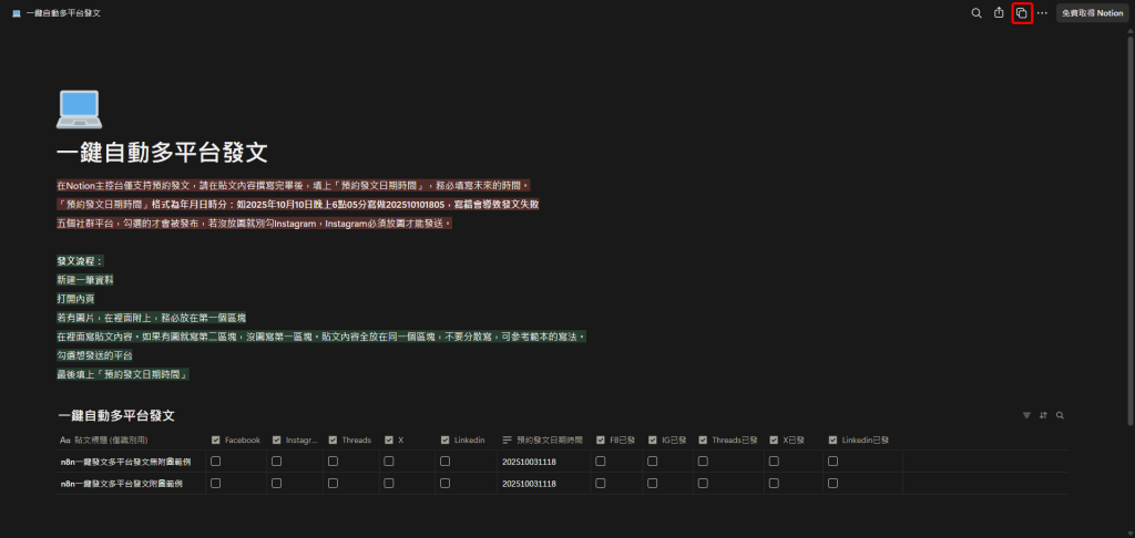 我會一步步帶你完成使用 n8n「一鍵自動多平台發文」模板的前置條件,打造一個專屬於你的社群自動化系統。設定完成後,你只需要在 Notion 寫好文章,按下一個按鈕,就能將內容自動分發到所有平台。
