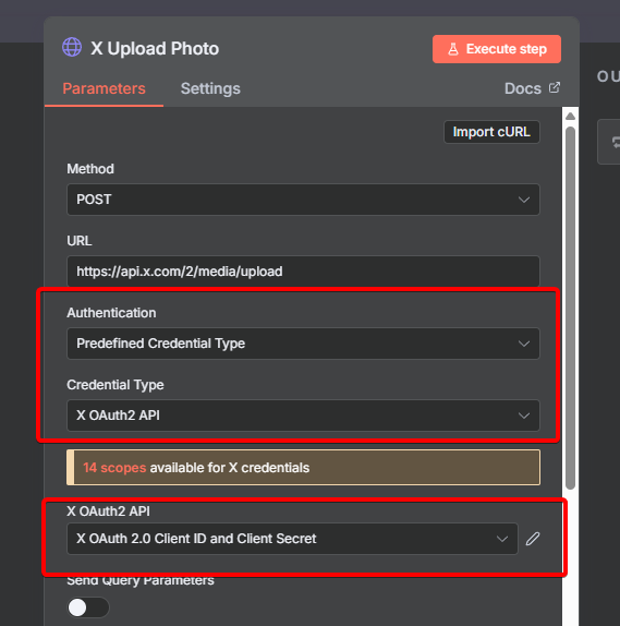 當你匯入模板後,因為沒有X的憑證,會導致節點的設定跑掉,你需要找到名為「X Upload Photo」的節點,雙擊它打開,將圖片裡紅框處的 Authentication 改成 Predefined Credential Type, Credential Type 改成 X OAuth2 API ,最後將 X OAuth2 API 改成你已經建立好的X憑證,若還沒建立能在此建立。