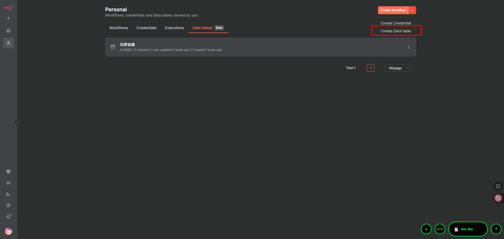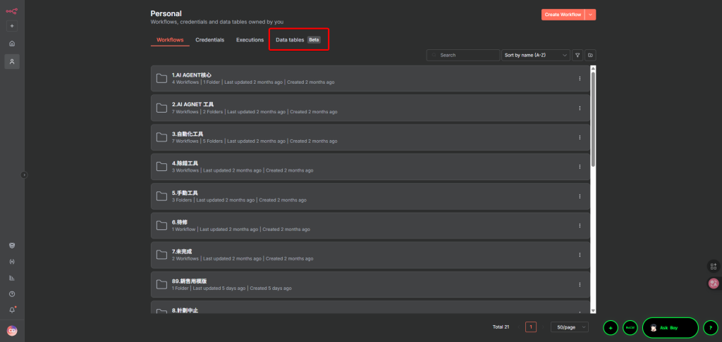 進入你的 n8n 頁面,新建一個工作流 (Workflow),按主選單右上紅框就按鈕就能新建。