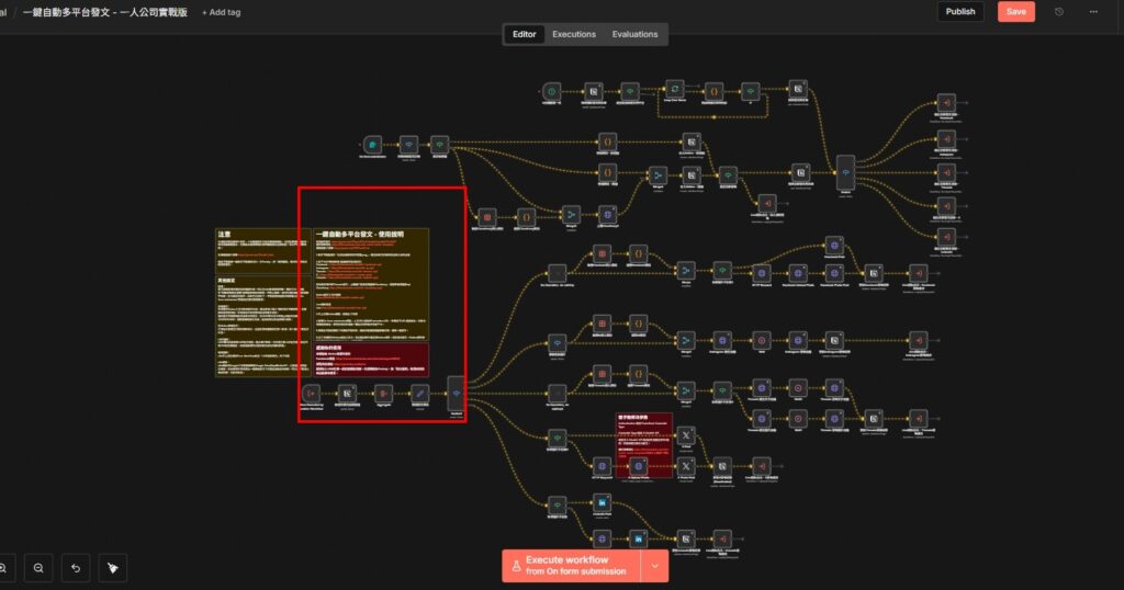 在n8n中,開發者會用便利貼(Sticky Notes)留下指引,告訴你每個區塊的功能、哪裡需要修改、以及注意事項。