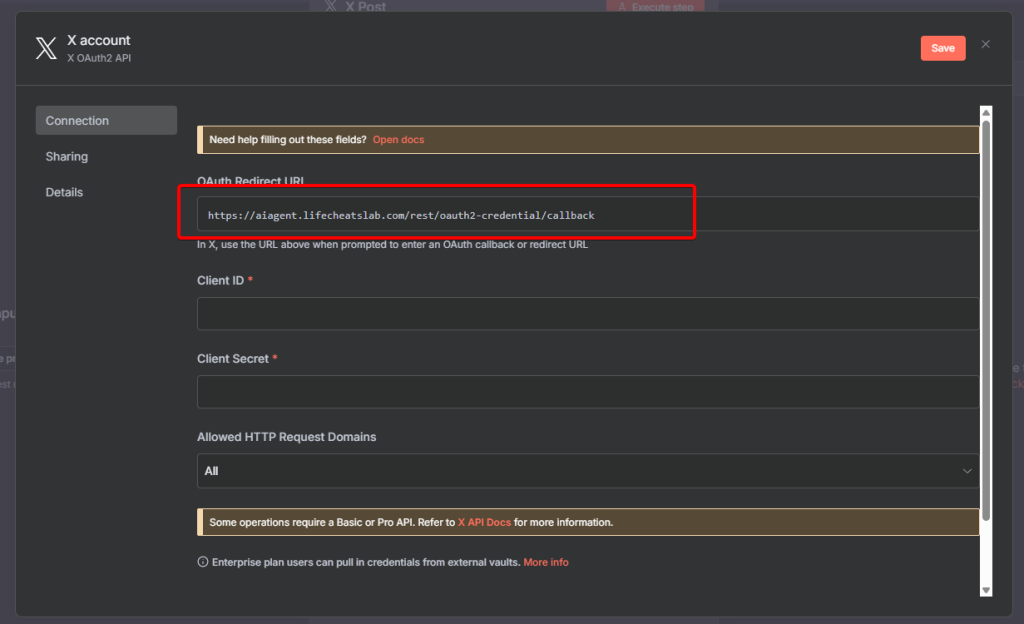 URL填寫n8n裡X憑證畫面中的重定向URL。