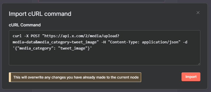 你能新建http節點,點擊右上紅框的按鈕,導入底下的cURL程式碼,就能獲得跟我一樣的上傳圖片節點。